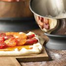 On a lightly floured surface, roll out the dough disk into a 12-inch round about 1/8 inch thick. Using a small knife, trim the uneven edges. Transfer the dough round to a parchment-lined baking sheet and refrigerate for at least 30 minutes.