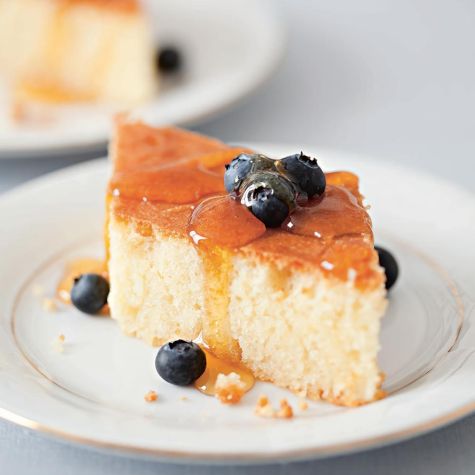 Remove from the oven. With the cake still in the tin, cut it into diamond-shaped pieces and pour over the cooled syrup. Let the cake absorb the syrup for at least 4 hours and preferably overnight. Remove from the tin and serve with fresh berries. For extra indulgence, drizzle with a little clear honey. Makes 1 cake.