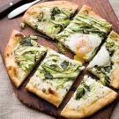 Eggs on pizza may seem like an odd idea, but one taste and you’ll be hooked. The warm yolk oozes over the pizza, adding creaminess to the sauce. The white color of the sauce also sets off the green of the asparagus, which is shaved into ribbons. This recipe makes twice as much dough as you will need. Place the second ball in a sealable plastic bag and freeze for up to 2 months and you’ll be ready to make another pizza whenever you like. When you're ready to use it, thaw the frozen dough for 3 to 4 hours at room temperature.