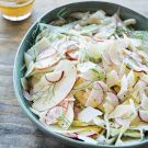 Trim the radishes, cut in half, and slice very thinly. Quarter the apple and slice very thinly. Add the radishes and the apple to the bowl with the fennel. Pour the vinaigrette over the salad and toss well to combine. Taste and adjust the seasoning, keeping in mind that the Parmesan will add saltiness.