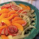 Cut off the stems, feathery tops and any bruised outer stalks from the fennel bulb. Cut the bulb in half lengthwise. Set the straight edge of the slicing blade on a mandoline for the thinnest possible slices. Starting with the cut edge against the guiding plate, slice the fennel halves lengthwise. Then slice the radishes. Set aside.