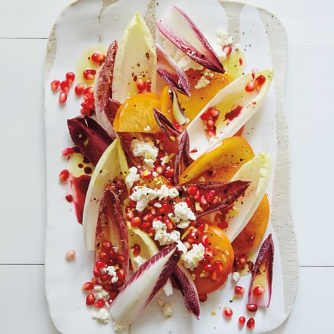 Trim the ends from the endive, separate the leaves and place in a large bowl. Remove the seeds from the pomegranate and pat the seeds dry. Using a mandoline or a very sharp knife, thinly slice the persimmons. Add the pomegranate seeds, persimmons and cheese to the endive leaves.