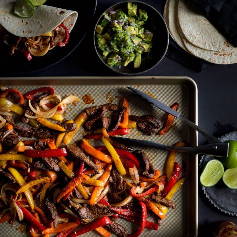In this easy supper, slices of flank steak, bell peppers and onion are roasted together, then tucked inside warm tortillas and topped with mashed avocado and a squeeze of lime juice. And since everything is cooked on a single baking sheet, cleanup is a breeze.