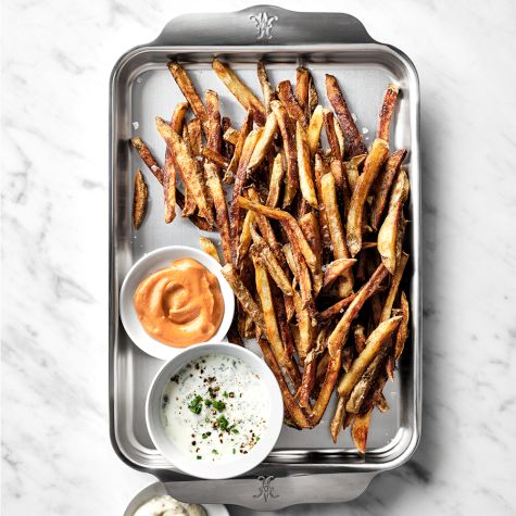 In the Williams Sonoma Test Kitchen, French fries reign supreme. They are simple to prepare and oven-baked, so you won’t get your stove top all oily. For an extra boost of flavor, toss them in rosemary and parmesan, or keep them simple and let the dips shine. Whatever you do, make sure you leave enough space for them to crisp up on the sheet tray. If you overcrowd, you risk soggy fries.