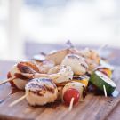 Cooking the shellfish on one set of skewers and the vegetables on another ensures perfect doneness for both. Grilling over an open fire accentuates the sweetness of the shellfish and vegetables.