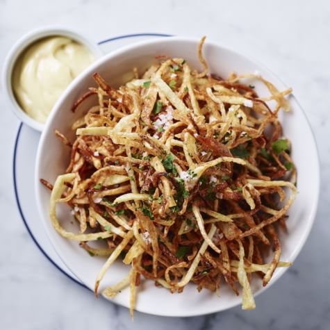 No French bistro meal would be complete without a heaping mound of frites, potatoes that are deep-fried to crisp perfection. To ensure that yours will measure up to bistro standards, take the time to squeeze the excess moisture from the julienned potatoes and then let them dry before dropping them into the hot oil. This will prevent the potatoes from sticking together and keep the oil from splattering.