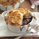 Raise the oven temperature to 400°F (200°F). Transfer the contents of the Dutch oven to a 9-by-13-inch (23-by-33-cm) baking dish or divide among individual gratin dishes. Cover the top(s) evenly with the potatoes. Bake until the topping is golden, 35 to 40 minutes. Serve immediately. Serves 6 to 8.
