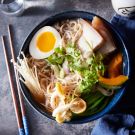 To assemble the dish, in a saucepan over medium heat, stir the broth starter into 7 cups (56 fl. oz./1.75 l) water. Alternatively, pour your homemade ramen broth in a large saucepan over medium heat. Add the shimeji mushrooms to the broth and bring to a simmer for 2 minutes.