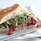 Split each focaccia square horizontally. Spread a thick layer of chutney on each focaccia bottom. Top each sandwich with some of the shredded brisket and the watercress, and close with the focaccia tops, pressing down gently. Cut each sandwich in half on the diagonal and serve. Serves 6.