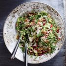 Two favorite autumn vegetables—brussels sprouts and kale—come together in this healthful salad. If you’ve never eaten these vegetables raw, you’re in for a delicious surprise. A sprinkling of pomegranate seeds adds a pop of color.