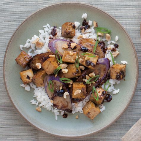 Divide the eggplant mixture among plates. Sprinkle with the green onions and peanuts and serve with the rice. Serves 4.