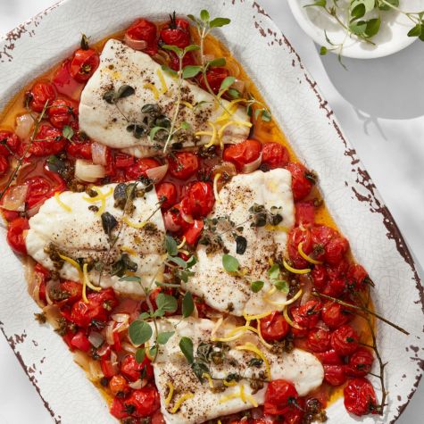 Surrounded by the Mediterranean, Italy’s island paradise of Sicily is well known for its vibrant cuisine that features sparkling fresh seafood such as swordfish, tuna and sardines. Here sea bass gets a typical Mediterranean treatment, served with slow-roasted tomatoes and bell peppers, briny fried capers, and, of course, plenty of fruity extra-virgin olive oil.