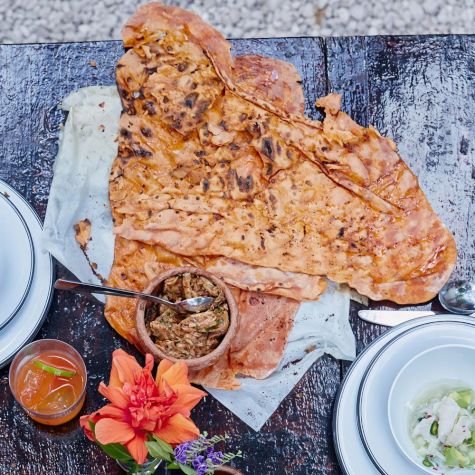 To serve, garnish the dip with the 1 1/2 tsp. of the chile lime salt and the huaya. Serve with the flatbread alongside. Serves 6 to 8.