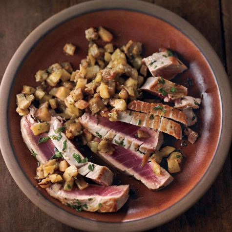 In this Italian-inspired dish, thick tuna steaks are seared over high heat, then cut into slices before serving, showcasing the beautiful bright-red flesh within. A crisp white like a Vermentino from Sardinia would be the perfect accompaniment.