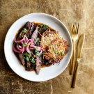 Remove the brisket from the slow cooker, transfer to a carving board, cover loosely with aluminum foil and let rest for 15 minutes. Cut the brisket across the grain into thin slices. Arrange the slices, slightly overlapping, on a serving platter and spoon some of the cooking liquid over the top. Sprinkle with the flaky sea salt and with the remaining sliced shallot and the parsley. Serve immediately. Serves 8 to 10.