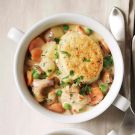 Chock-full of chicken, chanterelle mushrooms and other vegetables, this savory stew is braised in a slow cooker, then topped with herb-flecked biscuits and baked in the oven until golden brown.