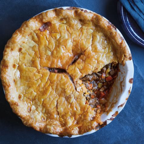 Pour the beef mixture into a 9 1/2-inch (24-cm) deep-dish pie dish. Place the dish on a baking sheet. Place the dough round over the filling, trim any excess overhang and then crimp the edges decoratively. Bake the potpie until the crust is golden brown, about 30 minutes. Serve hot. Serves 6 to 8.