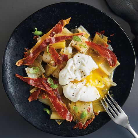 Slow-Cooker Braised Leeks with Prosciutto and Poached Eggs
