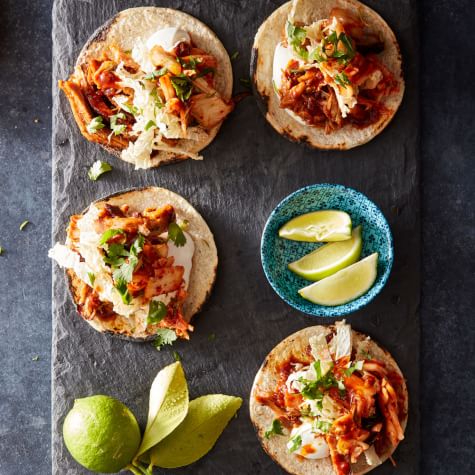 In this inventive use of one of our Korean-inspired braising sauces, we marry pork braised with chile and garlic with traditionally Mexican ingredients such as corn tortillas and crema for deliciously different Korean tacos. If your slow cooker doesn’t have a flameproof insert and a browning function, simply brown the pork in a Dutch oven or large sauté pan on the stove top over medium-high heat before transferring the pork to the slow cooker and adding the braising sauce.