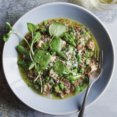 Bursting with flavor, this contemporary quinoa dish is a healthy one-pot slow-cooker meal. A splash of lemon juice and a generous measure of basil pesto add brightness, while lean chicken adds plenty of protein. Topped just before serving with watercress, asparagus and herbs, this fresh-tasting main makes a comforting springtime supper.