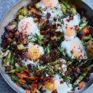 Add another 1 Tbs. of the olive oil to the pan and return to medium-high heat. Add the onion and carrots and cook, stirring occasionally, until the vegetables are softened and browned at the edges, 4 to 6 minutes. Add the asparagus and continue cooking, stirring occasionally, until the asparagus is softened, 2 to 3 minutes. Add the remaining 1 Tbs. olive oil and the potatoes to the pan and continue cooking, stirring occasionally, until the potatoes are lightly browned, 3 to 4 minutes. Return the mushrooms to the pan, stir to combine and season lightly with salt and pepper. Sprinkle the smoked trout evenly on top.