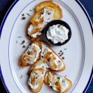 To assemble, spread a rounded tablespoonful of the cream cheese mixture onto each crostini. Divide the trout evenly among the crostini and season with pepper. Garnish with chives and serve immediately. Serves 6.