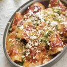 Bake until the cheese melts and the tortillas have absorbed the sauce, about 25 minutes. Top with the queso fresco and bake until slightly melted, about 5 minutes. Serve immediately. Serves 4 to 6.