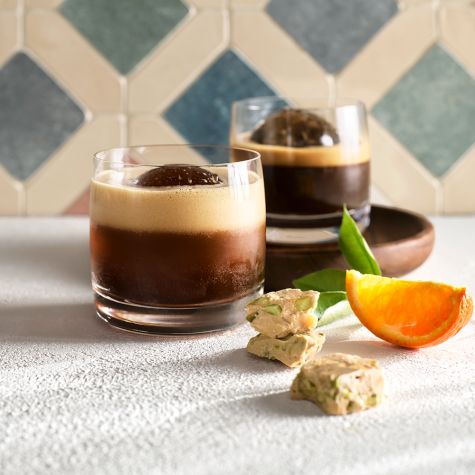 The popular Spanish cocktail known as carajillo combines strong coffee or espresso with Licor 43. Made from 43 natural ingredients, this liqueur boasts smooth vanilla and citrus flavors. In our variation on this chilled pick-me-up, we give the drink smoky notes by adding a shot of mezcal, while simple syrup gets a lift from cocoa powder and a dash of cinnamon. Although it’s optional, the rimmer of sugar, smoked sea salt and cinnamon on the glass lends smoky sweetness as you sip.