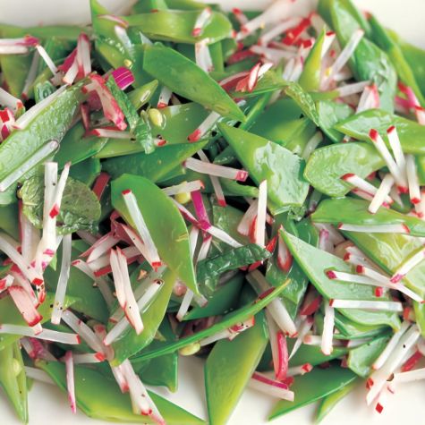 Cutting the radishes into thin slivers tempers their peppery bite and spreads it evenly throughout the dish. The sweet-tart honey-vinegar dressing provides a contrast to the spicy radishes and plays along with the sweetness of the snow peas in this springtime salad.