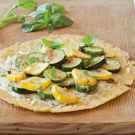 Popular in Provence, socca is a naturally gluten-free flatbread made from chickpea flour. The toppings in this recipe can be varied according to your taste. Summer squash and basil are perfect for summer, but in cooler weather you might want to try Gouda cheese with sautéed portobello mushrooms and thinly sliced radicchio.