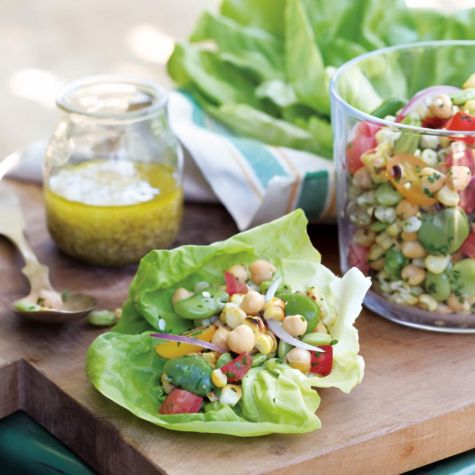Arrange the lettuce leaves into a bed on a serving platter or individual salad plates. Spoon the succotash on top of the lettuce and serve with the remaining vinaigrette on the side. Serves 6 to 8.