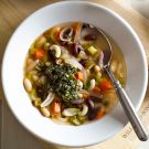 Mimi Thorisson shares this recipe in her book A Kitchen in France, where she explains that this Provençal soup is really just the French version of minestrone, and that the pistou, or pesto, that is stirred in at the end is also borrowed from their Italian neighbors. She continues, “Provençal pesto is usually made without pine nuts, and some versions add tomatoes to the mix, which I like. Leftover pistou is lovely on grilled bread with aperitifs.”