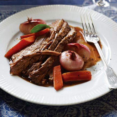 Cut the brisket across the grain into slices. Transfer to a large platter and spoon the vegetables over and around the meat. Drizzle some of the sauce over the meat and pour the rest into a bowl. Garnish the platter with fresh bay leaves. Serve immediately and pass the sauce at the table. Serves 10.