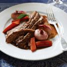 Cut the brisket across the grain into slices. Transfer to a large platter and spoon the vegetables over and around the meat. Drizzle some of the sauce over the meat and pour the rest into a bowl. Garnish the platter with fresh bay leaves. Serve immediately and pass the sauce at the table. Serves 10.