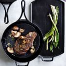 About 10 minutes before you want to serve the steak, in a cast-iron fry pan over medium heat, melt the remaining 2 Tbs. butter. Add the mushrooms and cook, stirring occasionally, until golden brown and tender, 6 to 8 minutes. Transfer to a bowl and set aside.