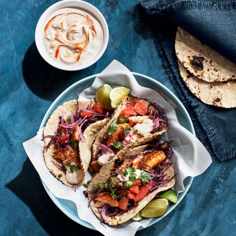 Step up your taco game! This recipe features salmon cooked sous vide, a favorite technique with restaurant chefs because it produces tender, moist fish every time. Although the ingredient list is long, much of the work can be done ahead of time. You can cook the salmon in the water bath, then refrigerate it in the vacuum bag for up to 4 days. Just before serving, give the fish a quick sear in a fry pan to create an appealing golden crust. The crema can be made a week in advance and the slaw, the night before serving. A piquant spice blend does double duty here, seasoning both the salmon and the crema. Our refreshing grapefruit-cabbage slaw helps tame the heat. Be sure to salt the shredded cabbage in advance; this helps to soften it and remove excess liquid, producing a bright-tasting slaw with a crisp bite.
