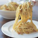 Drain the pasta, leaving a bit of water clinging to it, and add it to the bowl with the eggs and cheeses. Toss quickly (this will heat the eggs and leave a creamy coating on each strand of pasta). Add the pancetta with all of the pan juices. Season with salt and a generous amount of pepper. Add the parsley and toss again. Serve immediately. Makes 4 main-course or 6 first-course servings.