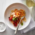 Weeknight dinners don’t get much easier than this. What’s the secret to this speedy pasta sauce? A great jarred version plus a handful of fresh cherry tomatoes.