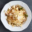 Add the pasta to the sauté pan with the bread crumb and brussels sprout mixture, tossing to combine and adding more olive oil if needed to lightly coat the pasta. Toss in the cauliflower and season to taste with salt and pepper. Divide between 2 serving bowls and serve immediately, passing the pecorino romano alongside for sprinkling on top. Serves 2.