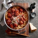 Meanwhile, bring a large pot of salted water to a boil over high heat. About 10 minutes before the meatballs are done, add the pasta to the boiling water and cook until al dente (tender but firm to the bite), according to the package instructions. Drain and add the pasta to the pan with the meatballs. Using tongs, gently toss to combine.