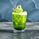 To serve, add a large ice cube to each chilled tumbler. Pour the sparkling green juice over the ice, filling the glasses. Gently twist the shaved celery garnishes, then place a garnish on top of the ice cube in each tumbler and serve immediately. Serves 4 to 6.