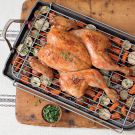 Transfer the chicken to a cutting board, cover loosely with aluminum foil and let rest for 10 minutes before carving. Meanwhile, remove the rack from the griddle. Reduce the oven temperature to 400°F, return the vegetables to the oven and roast for 10 minutes more.