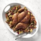 Transfer the chicken to a cutting board and let rest for 10 to 15 minutes. Carve the chicken into pieces and serve with the vegetables. Serves 4 to 5.