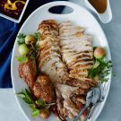 To carve the turkey, remove the legs and then carve the whole breast off the bird. Slice the breast on a diagonal against the grain. Transfer to a platter and serve the gravy alongside. Serves 6 to 8.