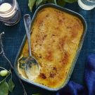 Pour the mixture into a 9-by-12-inch (23-by-30-cm) baking dish and place it in a larger pan, such as a roasting pan. Add enough boiling water to the larger pan so that it comes halfway up the sides of the smaller baking dish. Cover the pans loosely with aluminum foil and bake until the custard is just set, about 30 minutes.