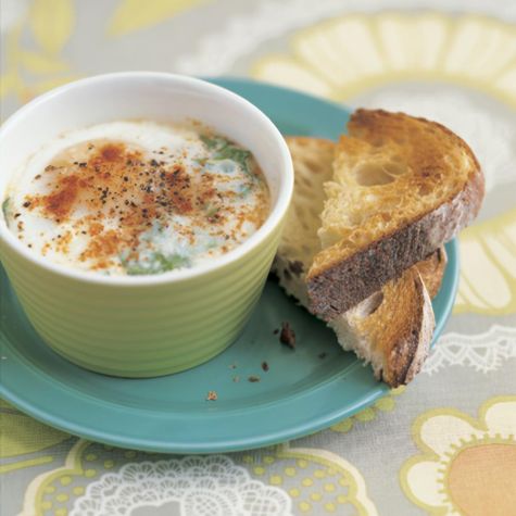Generously butter the insides of four 6-oz. ramekins. Divide the spinach among the ramekins and crack an egg over the top. Drizzle 1/2 Tbs. cream over each egg and season lightly with salt and pepper. Sprinkle the eggs with the smoked serrano chili powder, dividing evenly.