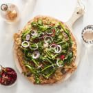 Using the pizza peel, transfer the pizza to a cutting board. Drizzle lightly with olive oil and top with the remaining uncooked onion and chiles. Sprinkle with flaky sea salt, Parmesan and red pepper flakes. Cut into slices and serve immediately. Serves 4.