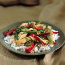 Whisk the sauce mixture and pour into the pan. Cook just until the liquid comes to a boil. Spoon the rice onto individual plates and top with the stir-fry and sauce. Serves 4.