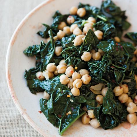 Dinosaur kale, also known as cavolo nero or Lacinato kale, has slender, blue-green crimped leaves and a mild cabbagelike taste. Here, it is sautéed with chickpeas to make a hearty side dish, with just a touch of chili heat.