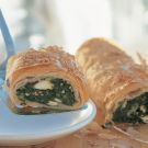 Lay out 1 filo sheet on a work surface and lightly brush with melted butter. Cover with a second sheet and brush it with butter. Repeat with the remaining sheets, brushing each one with butter. Spoon the spinach mixture in a line on a long side of the filo stack, leaving a border of about 1 1/2 inches uncovered on the ends and the side. Fold the long border over the filling, fold in the ends and then gently roll up the dough, encasing the filling.